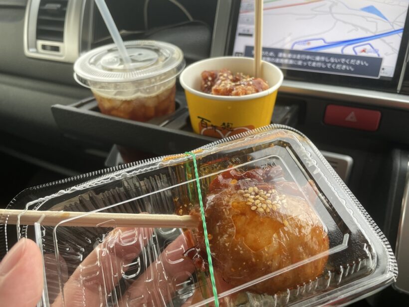 唐揚げと肉巻きおにぎりを食べながら目的地へ向かいました。