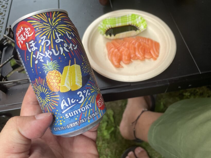 その後も爆睡の虹パパさんを肴に、楽しく話をして焚き火が落ち着いたところで寝ました(笑)